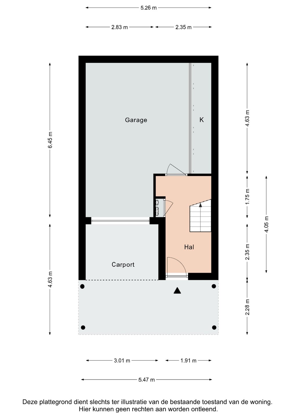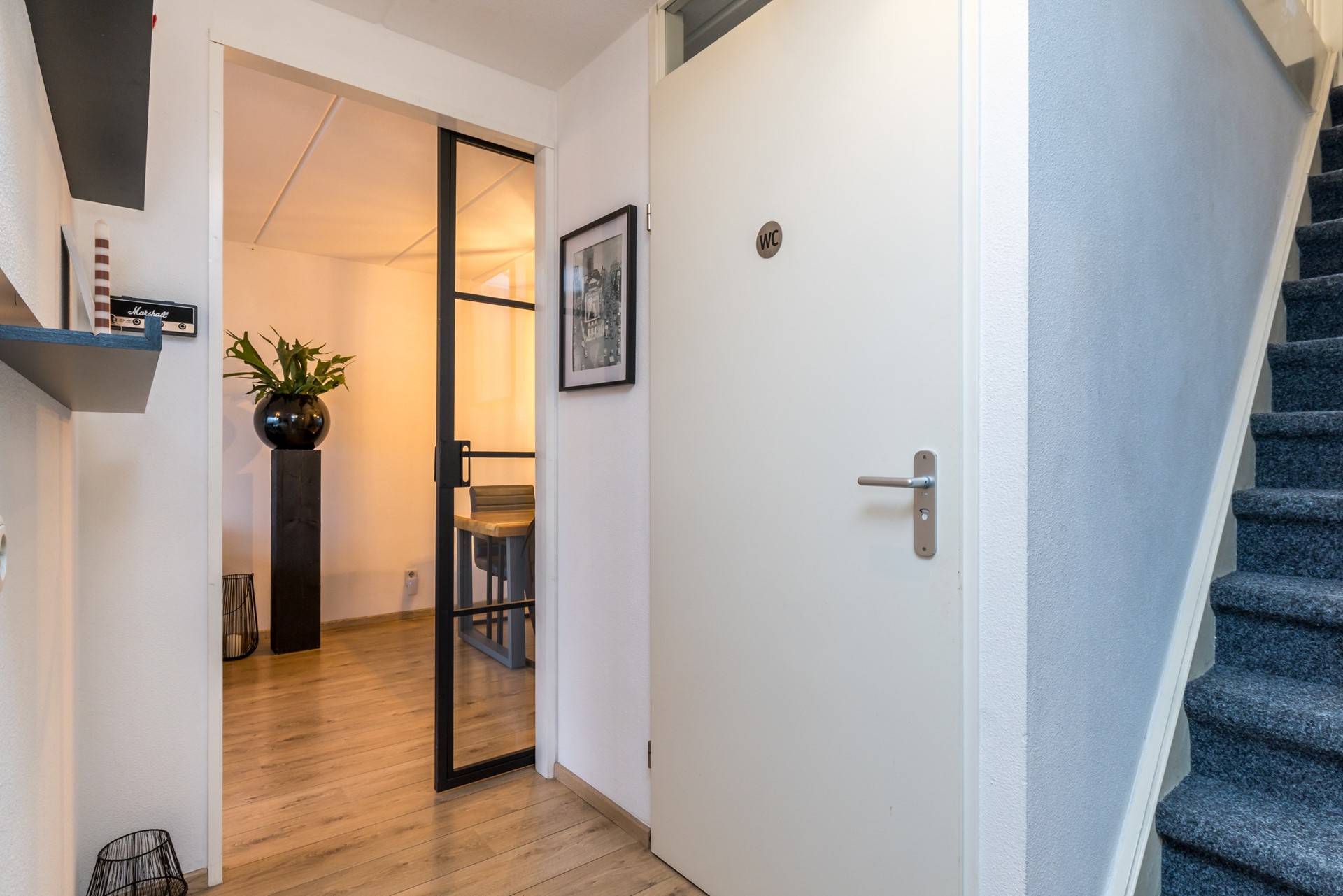 Overdekte entree. Hal voorzien van laminaatvloer met garderobe en meterkast.