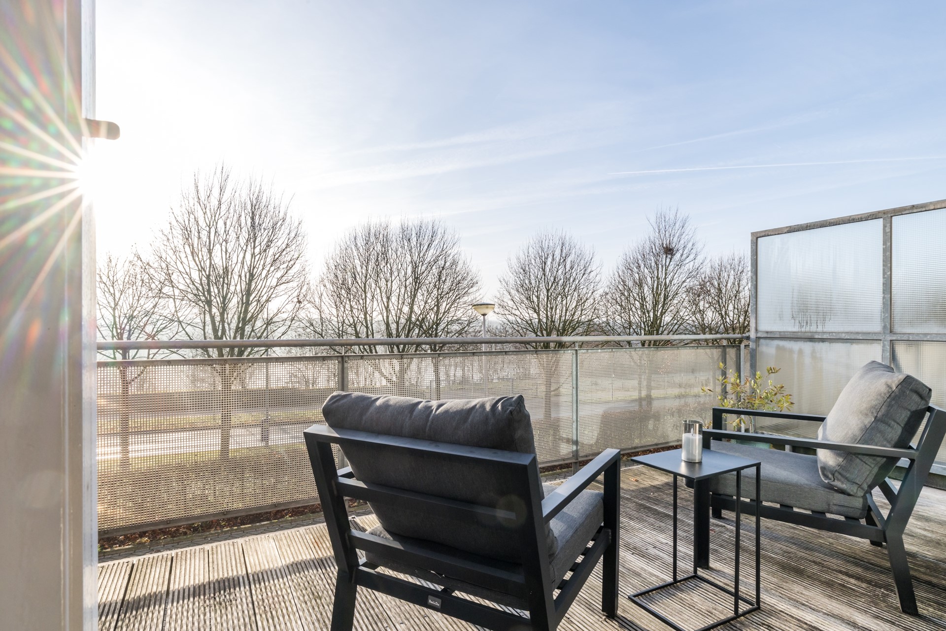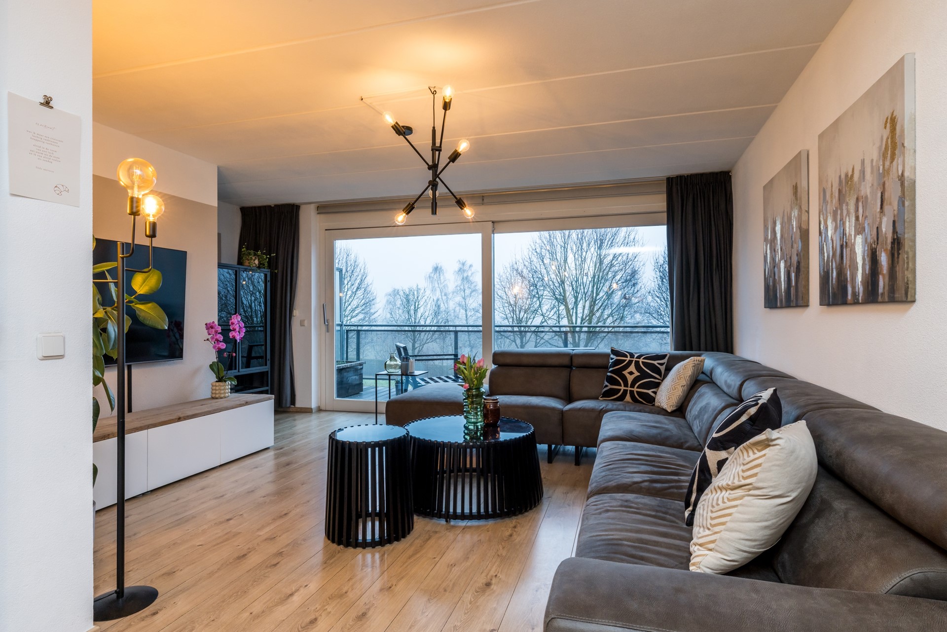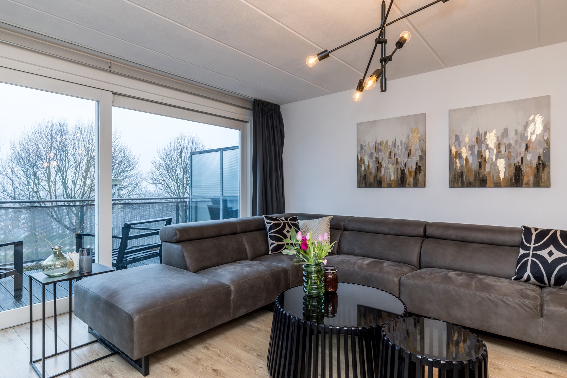 De daglichtrijke L-vormige woonkamer heeft een laminaatvloer en geeft middels een schuifpui toegang naar het ruime balkon (ca 5.25 x 2.50m), gelegen aan de zuidkant met nieuw zonnescherm en hardhouten vlonders.