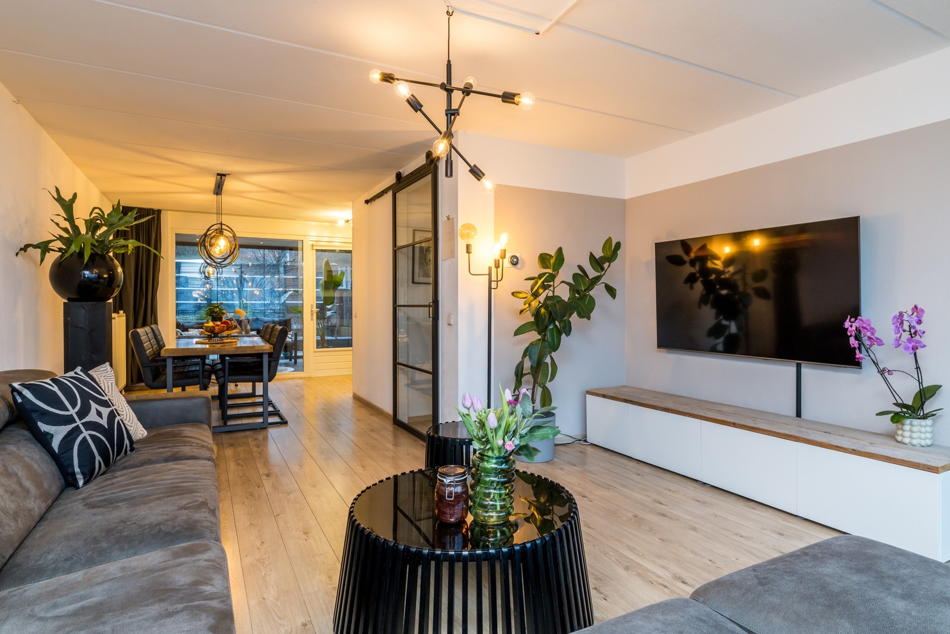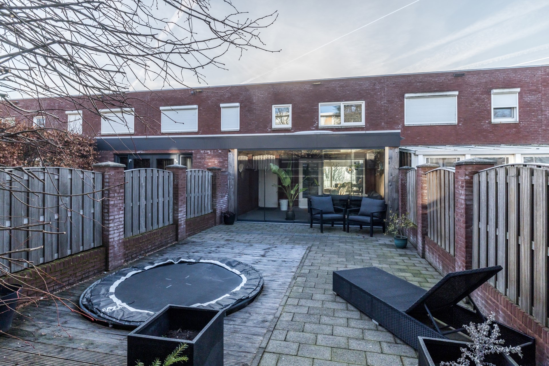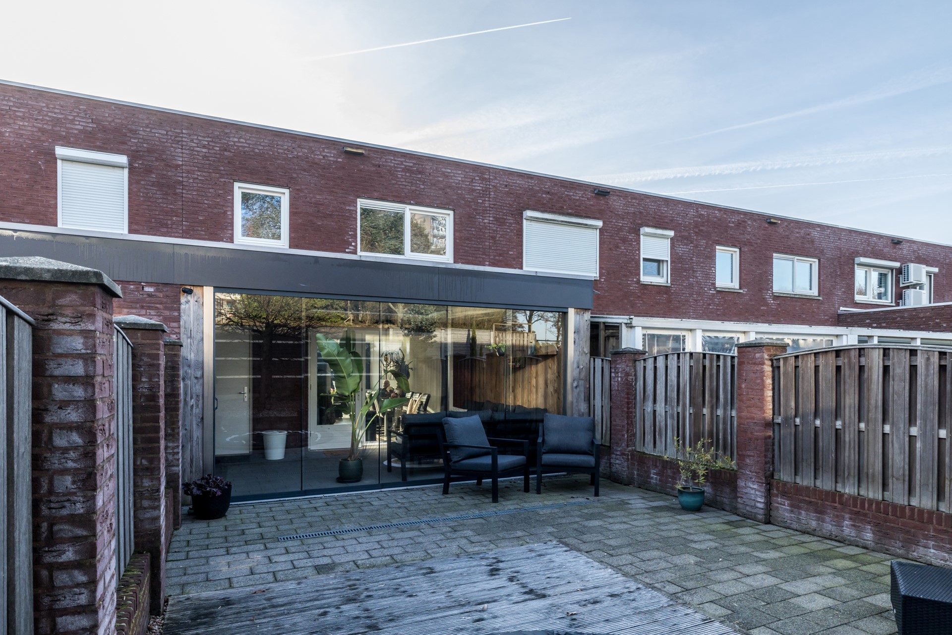 De tuindeur staat in directe verbinding met de fraaie tuinkamer en de onderhoudsvriendelijk geheel bestraatte omsloten tuin met optimale privacy en achteringang.