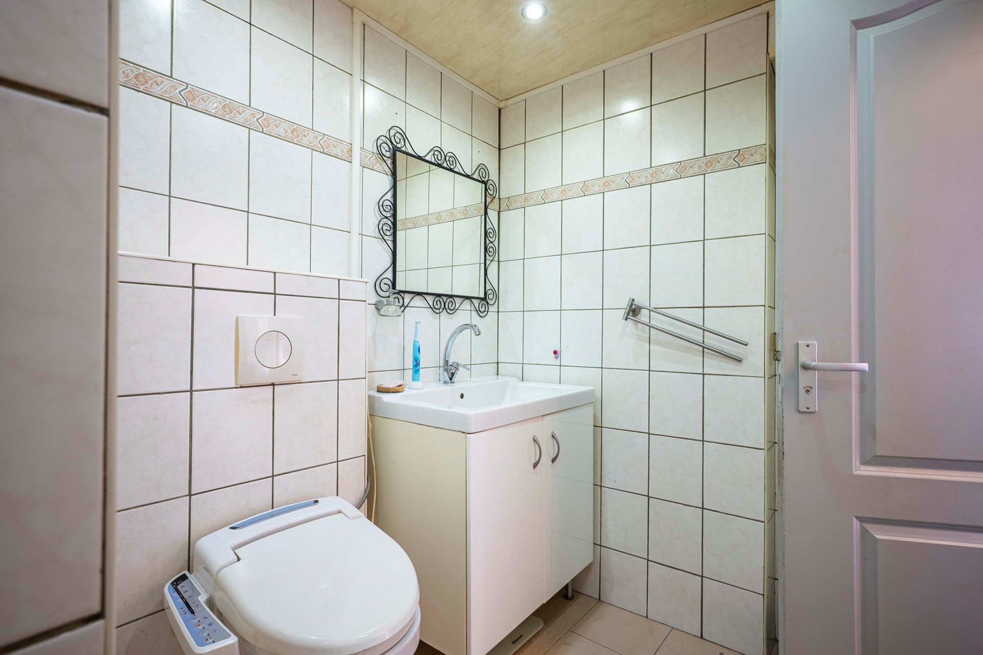 Ruime badkamer ca. 6 m² met douche, toilet en wastafel.