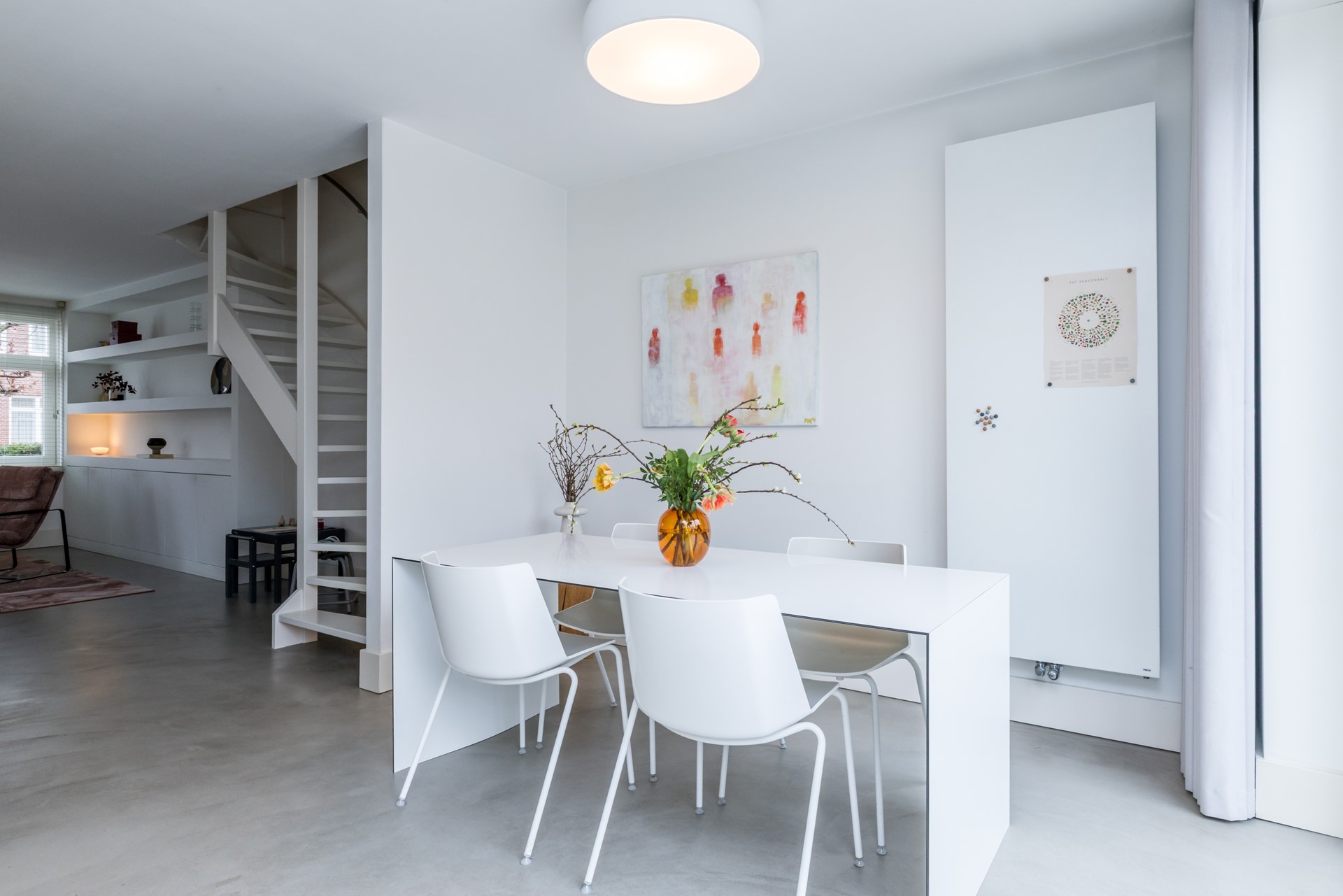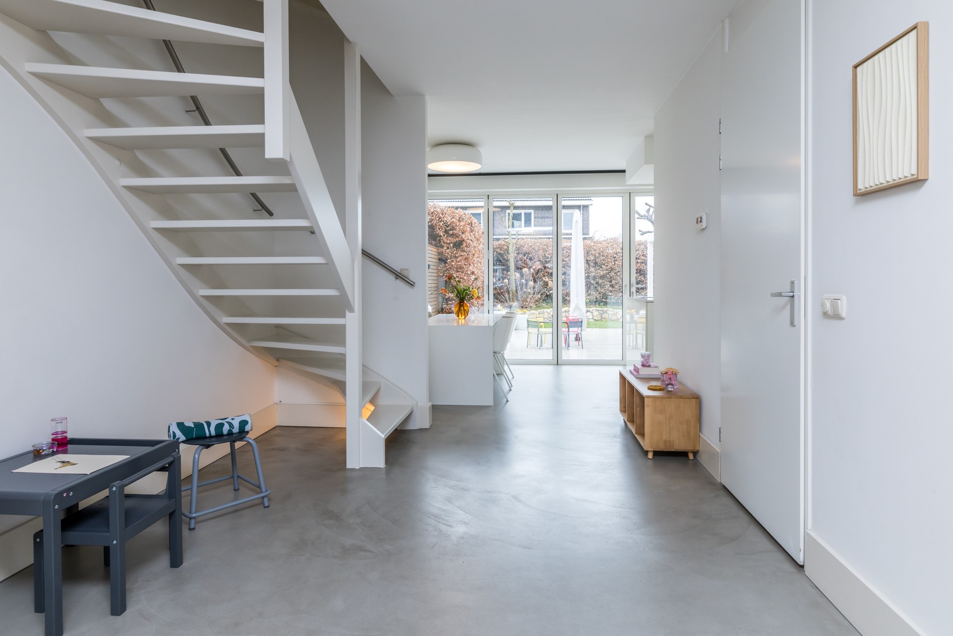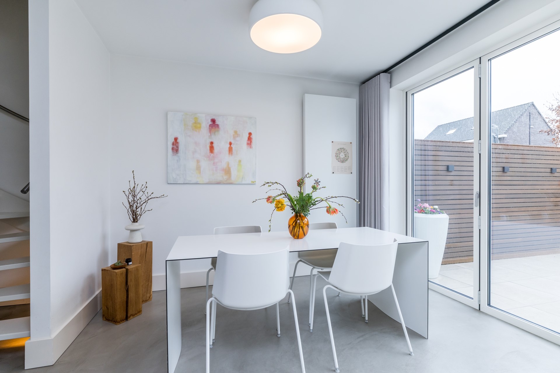 • Sfeervolle woonkamer met veel lichtinval, vaste kastenwand en harmonica schuifpui in de open keuken, welke een prachtige verbinding met de tuin creëert.