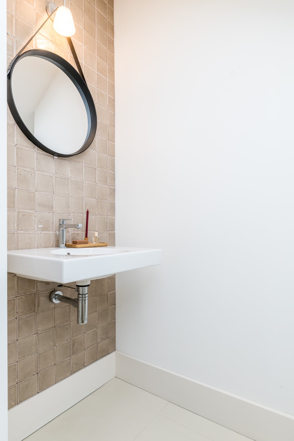 • Moderne toiletruimte met hangend toilet en fonteintje.