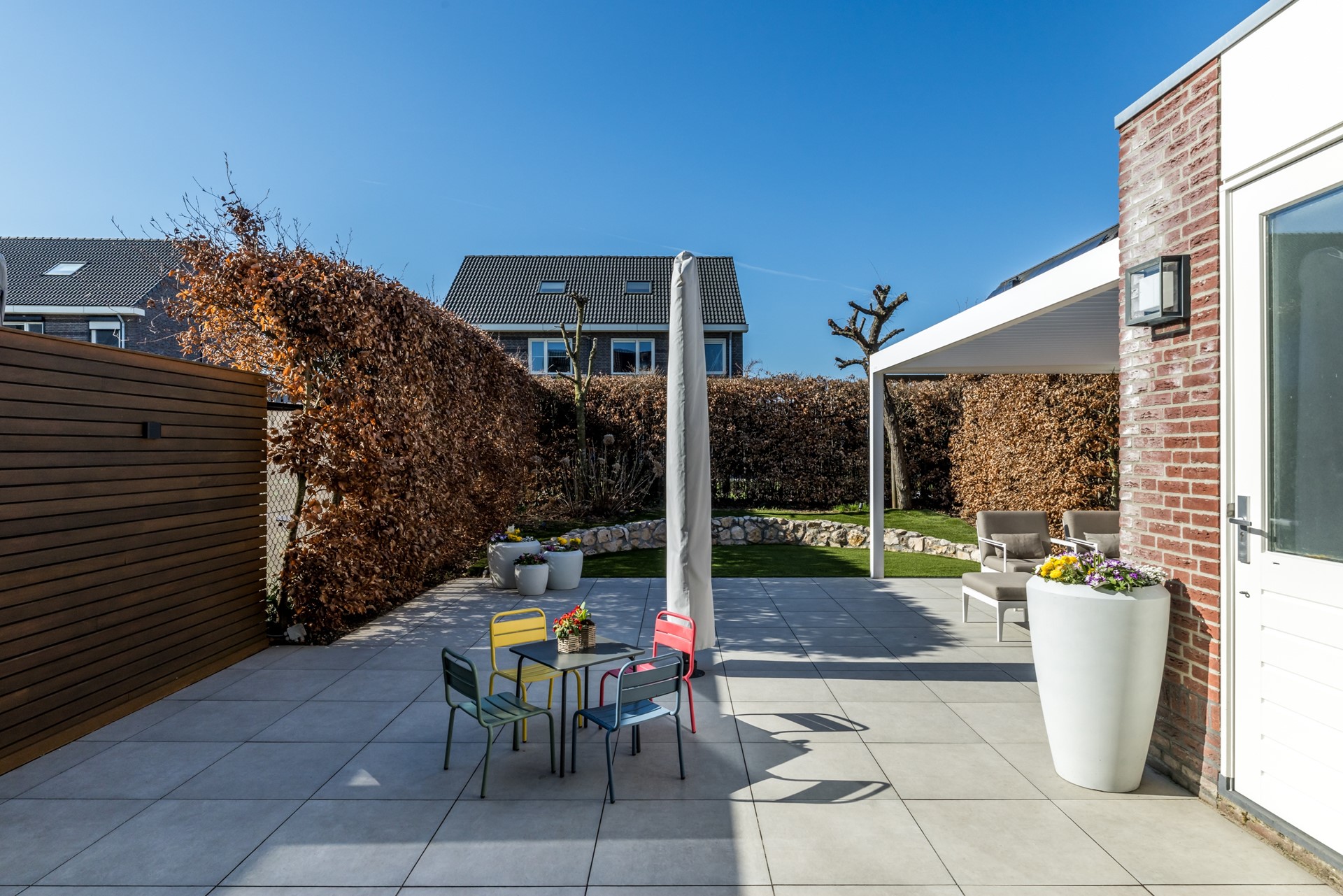 De fraai aangelegde achtertuin (2023, gelegen op het zuidwesten) beschikt over een royaal terras met grote terrastegels en een luxe overkapping met lamellendak (Brustor, 2023). Een moderne houten schutting biedt extra privacy. Het gazon (kunstgras) wordt omrand door een natuurstenen border, terwijl volwassen bomen en hagen zorgen voor een groene en beschutte sfeer. Een onderhoudsvriendelijke tuin met meerdere zitplekken waar je volop kunt genieten.