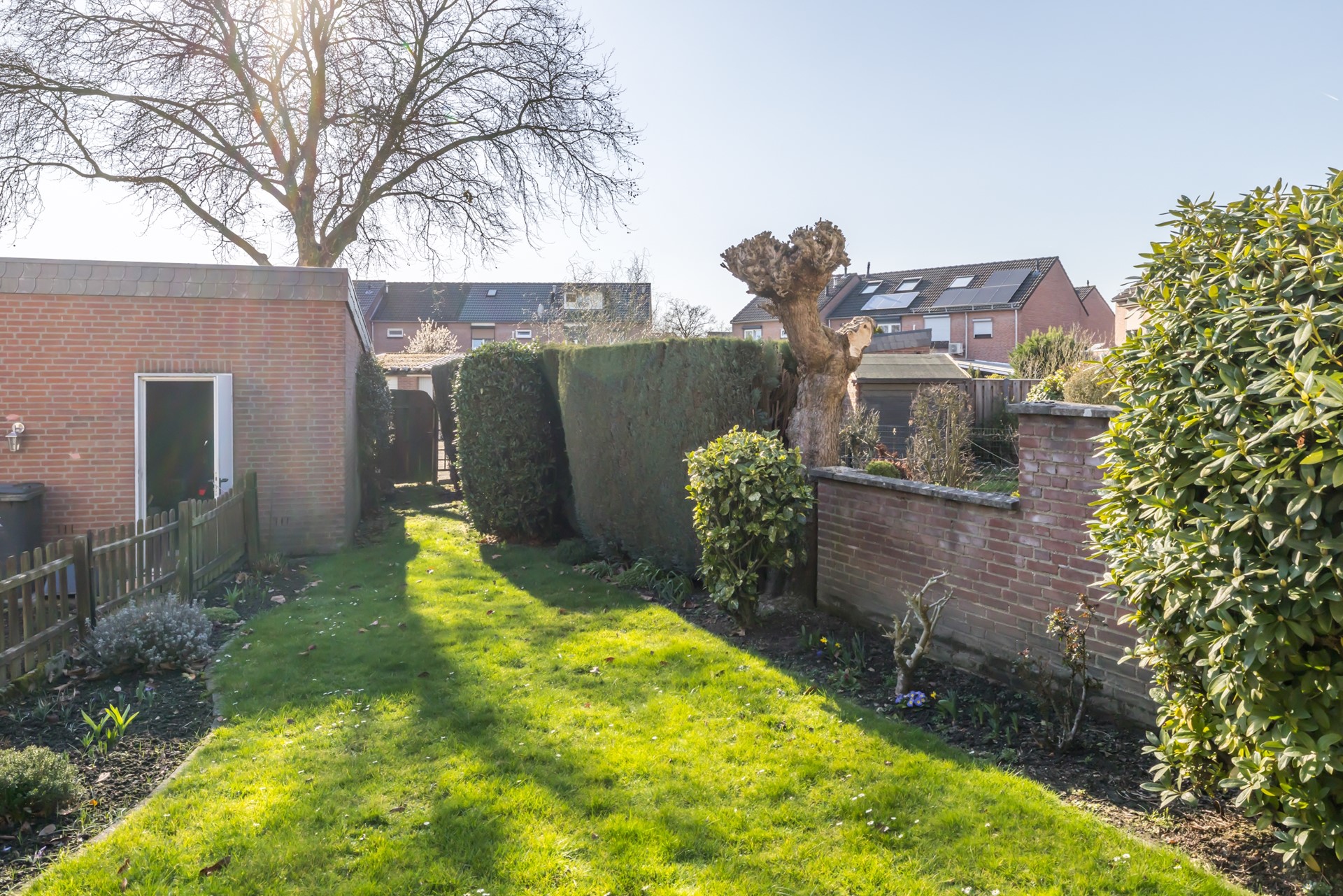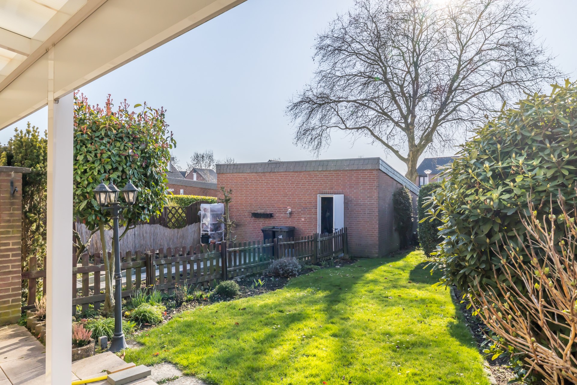 Vanuit de keuken toegang tot een overdekt terras en de omsloten tuin met achterom ingang.