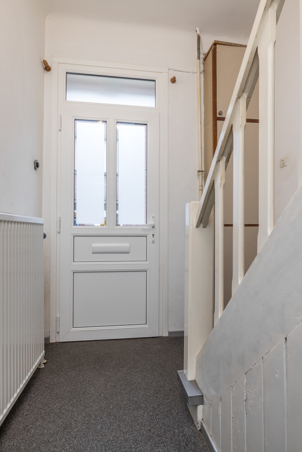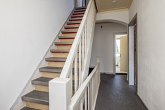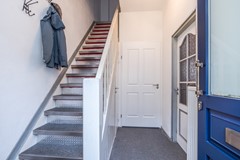 Entree en hal met de meterkast, gedeeltelijk betegeld modern toilet met fonteintje met trap naar de 1e verdieping.