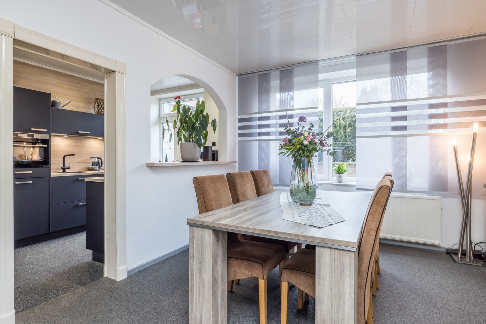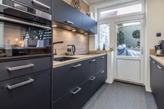 Via de hal kom je in de woon-eetkamer met moderne keuken gesloten keuken uit 2022 welke toegang geeft tot de patio tuin.