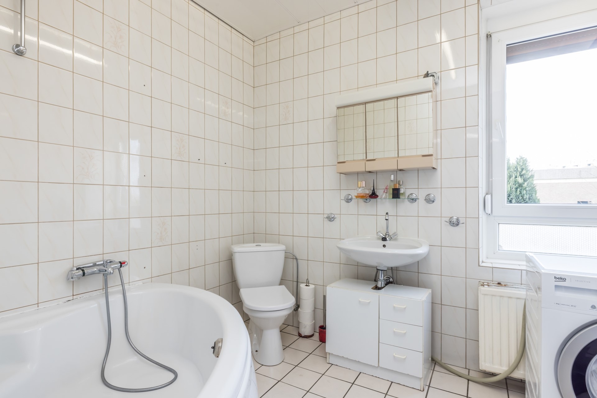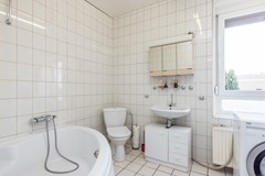 De betegelde badkamer is voorzien van een ligbad/ douche combinatie, vaste wastafel met een 2e toilet.