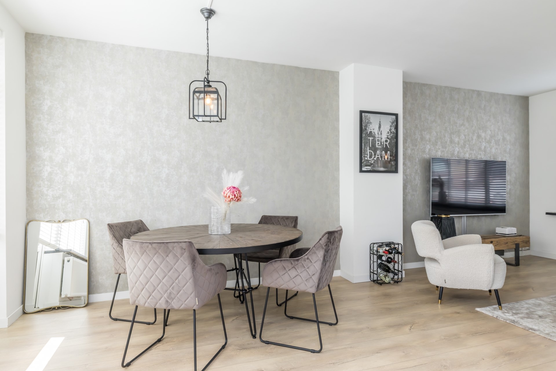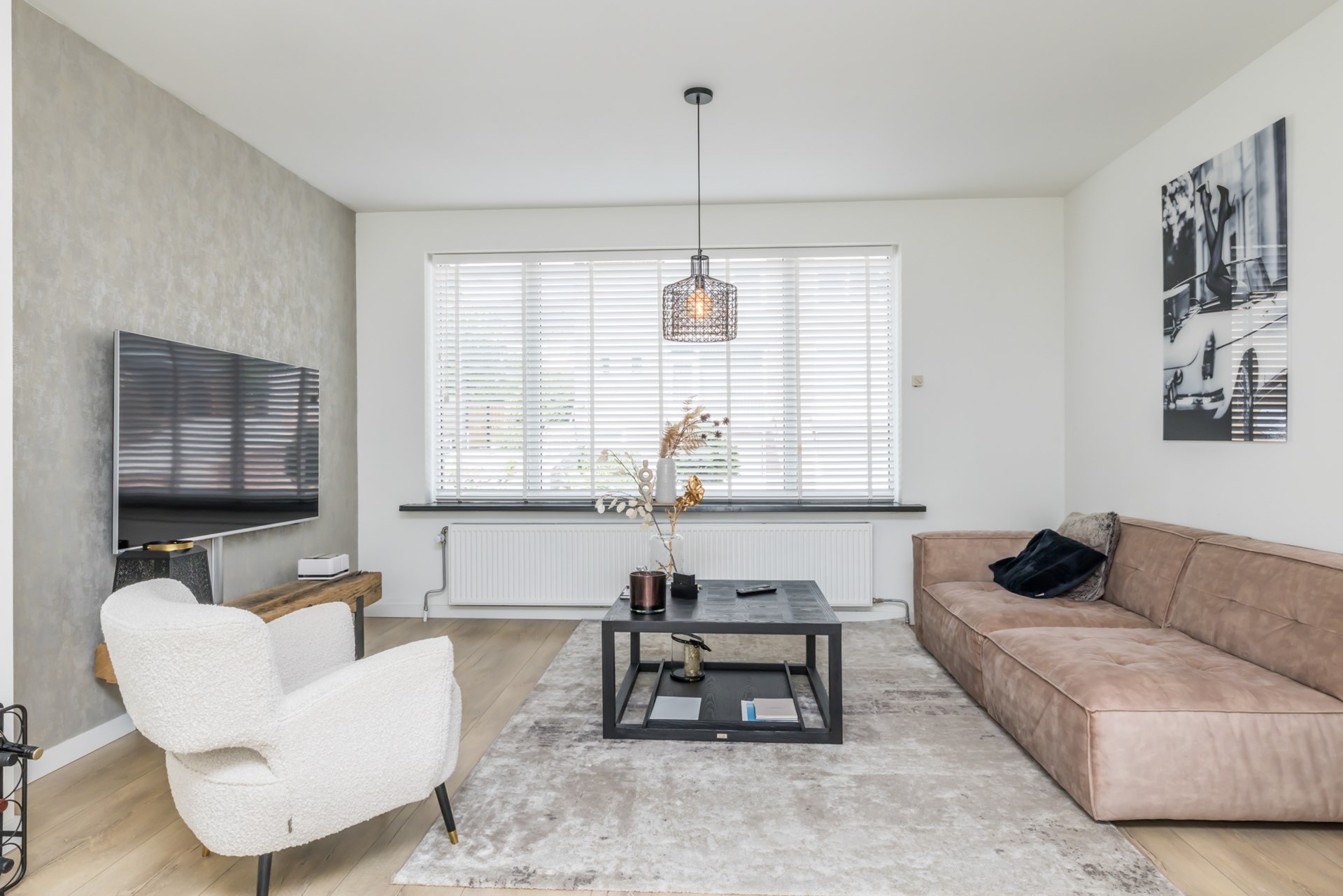 - Moderne toiletruimte, voorzien van hangend toilet en fonteintje.- Woonkamer, voorzien van laminaat.