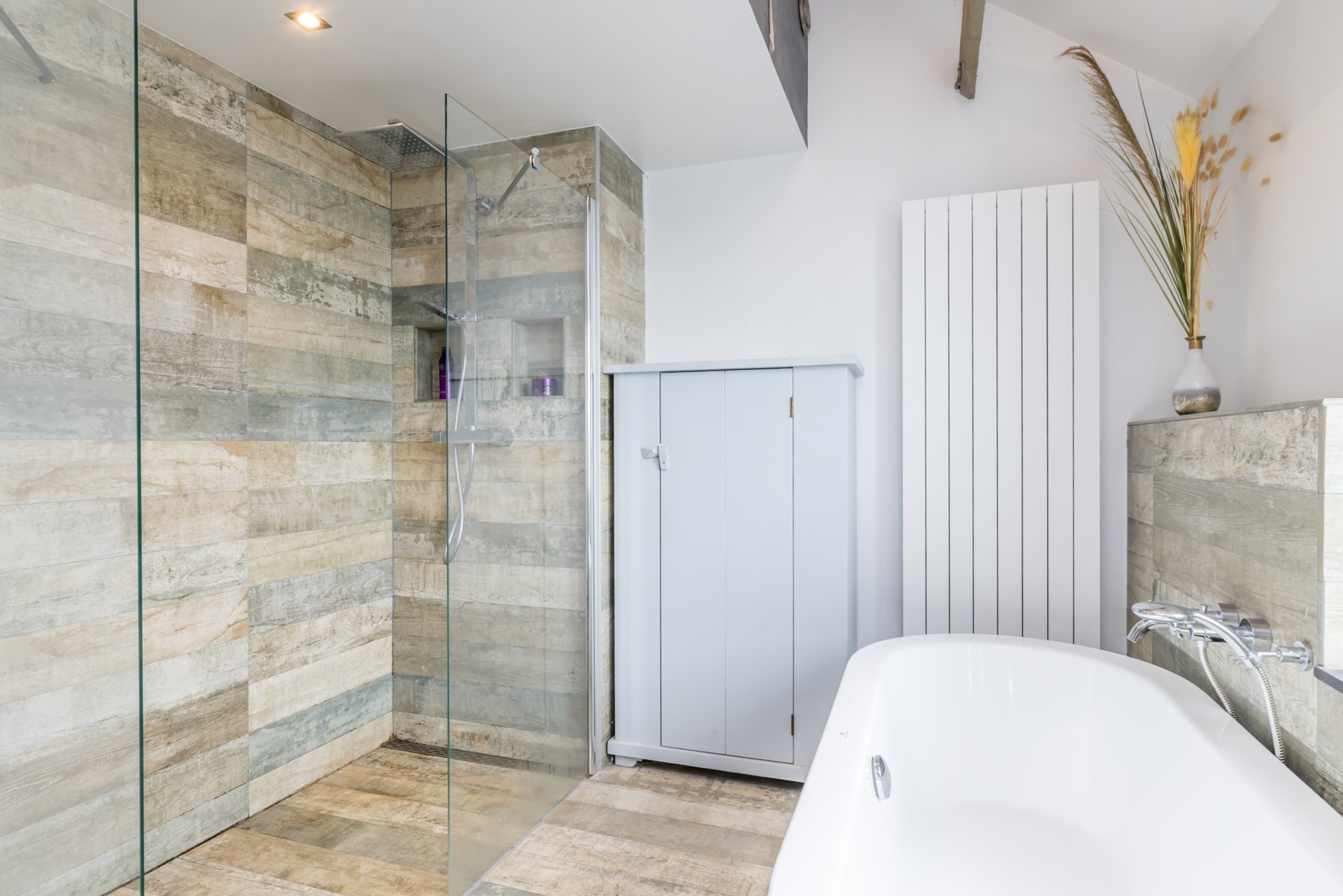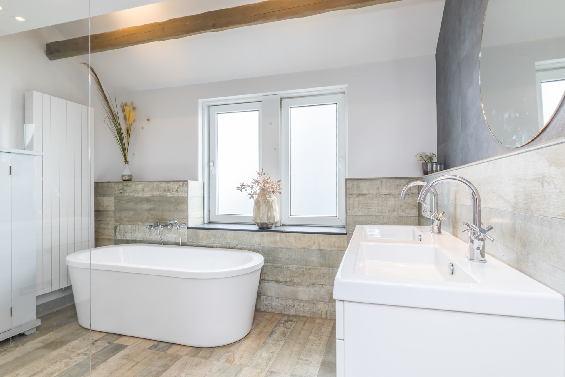 - Moderne badkamer, voorzien van inloopdouche, vrijstaand ligbad, hangend toilet en dubbele wastafel.
