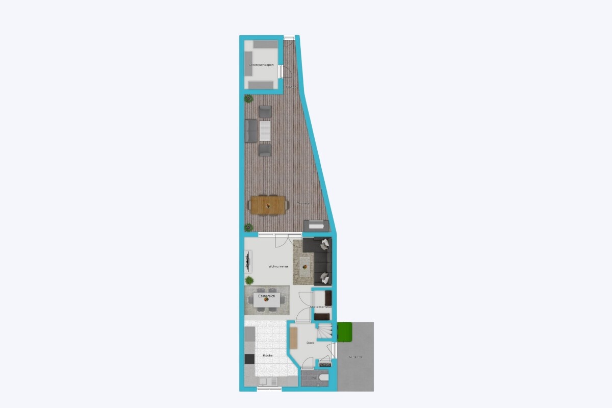 Vanuit de hal bereikt u de lichte woonruimte, waar koken, eten en wonen op harmonische wijze samenkomen. De hoogwaardige inbouwkeuken, de royale eethoek en de gezellige woonkamer met directe toegang tot het terras creëren een aangename woonsfeer.