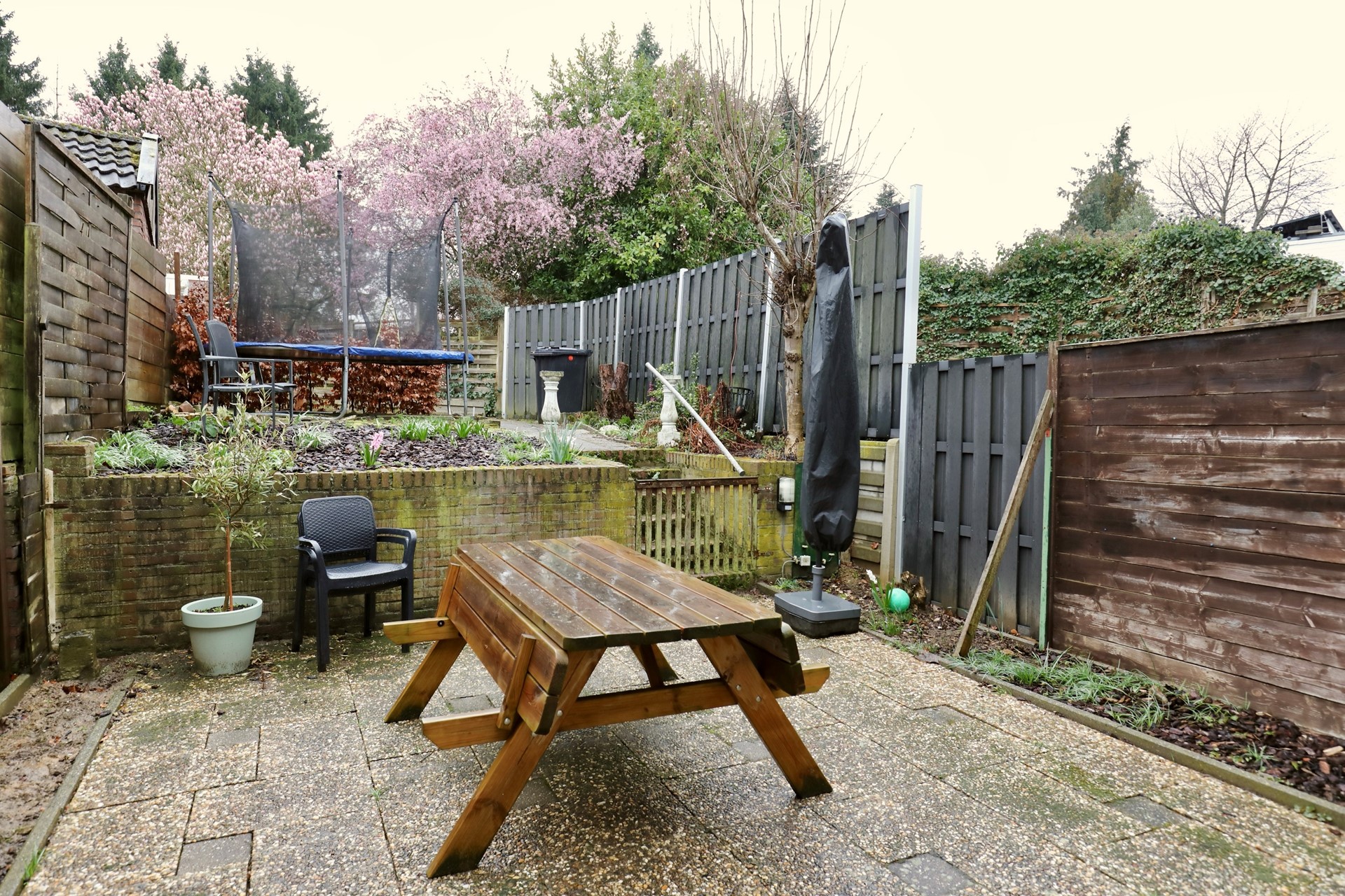 - Rustige en zonnige tuin met zonnescherm op het zuiden